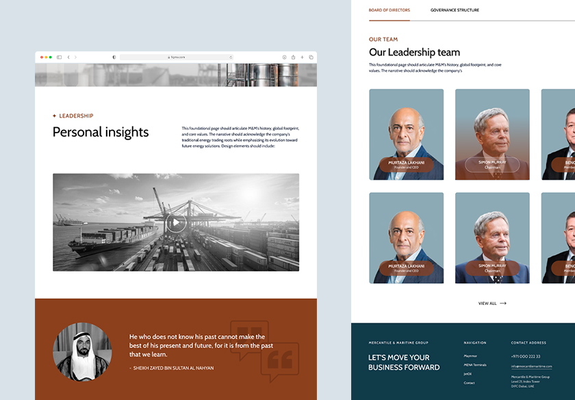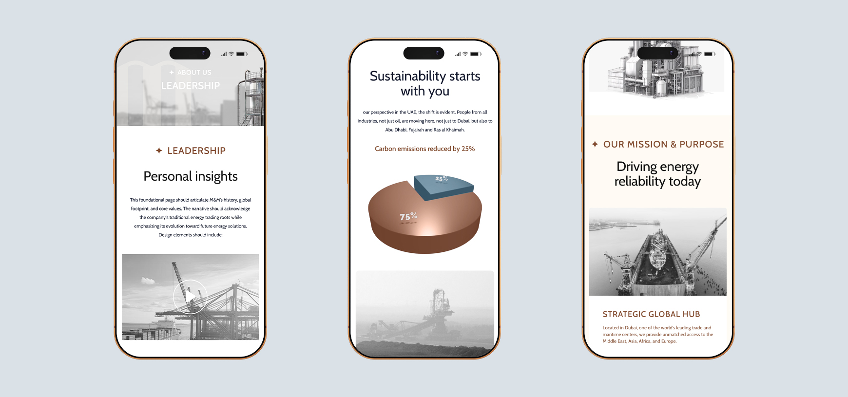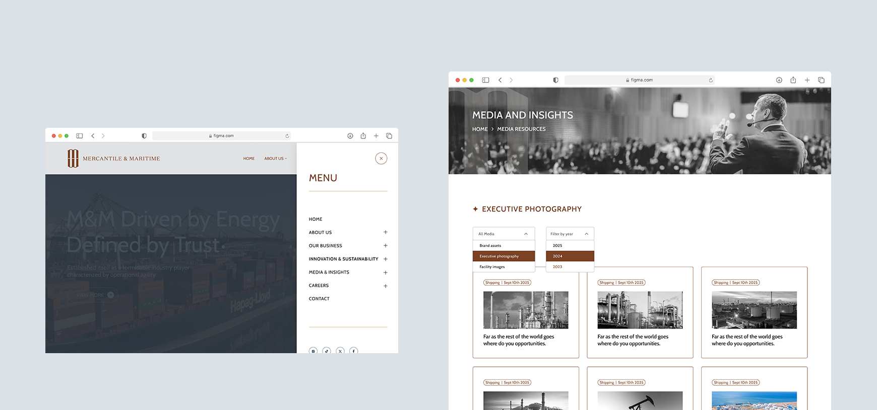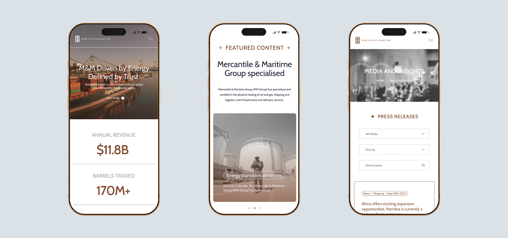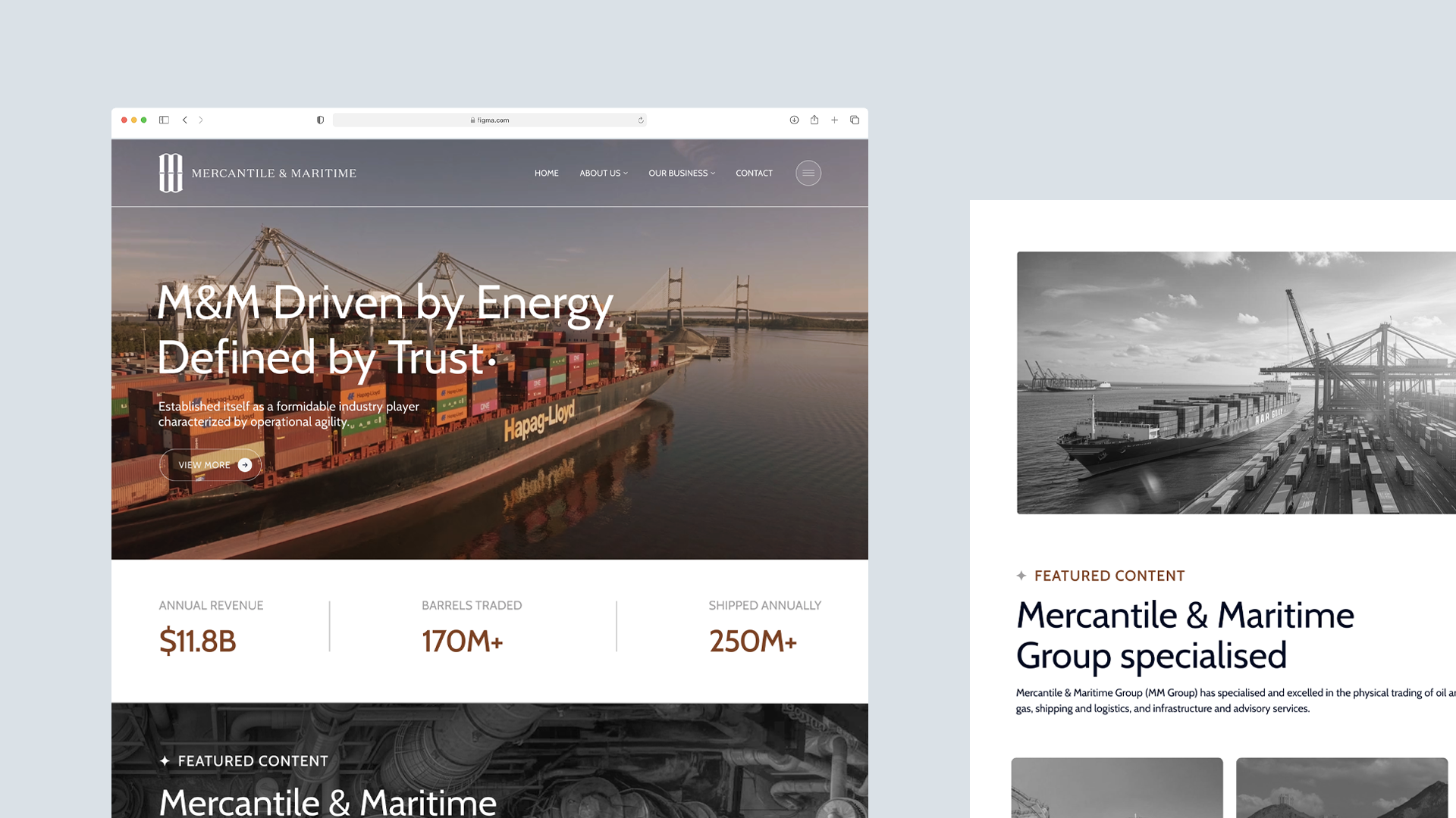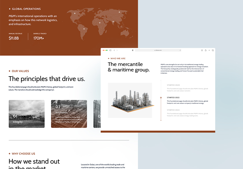 This project involved designing a modern, mobile-friendly website for Mercantile & Maritime, a global energy and commodities trading group with operations across multiple continents. The goal was to establish trust and showcase the company’s complex, multi-vertical business while highlighting its global presence. My role focused on creating a structured, scalable, and visually engaging platform that balances a polished corporate tone with clarity and operational depth.