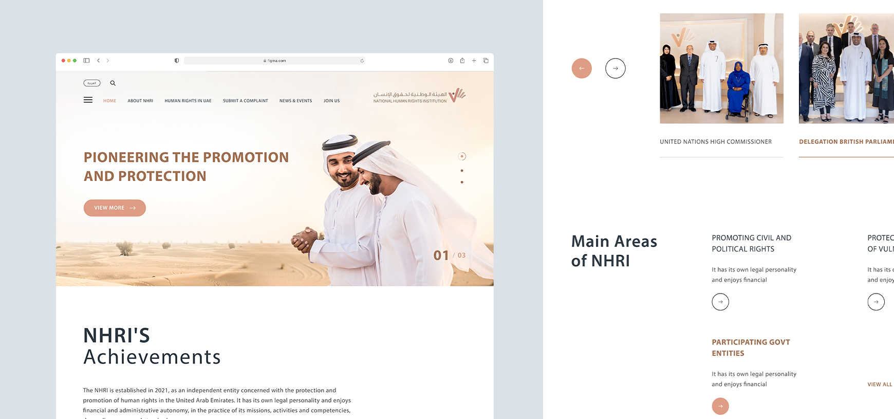 The redesign delivers a user-centered experience that clearly reflects NHRI’s mission and public responsibility. The homepage features a strong hero section with prominent calls to action, while content is organized into meaningful sections—including Services, Rights Education, Reports & Resources, and News & Media—for easier navigation and understanding. A clear visual hierarchy, grid system, refined typography, consistent spacing, and human-centered imagery enhance readability, accessibility, and credibility. Prominent call-to-action buttons guide users to essential services such as submitting complaints, learning about their rights, contacting NHRI, and accessing official reports. Overall, the redesign prioritizes clarity, usability, and professional aesthetics.