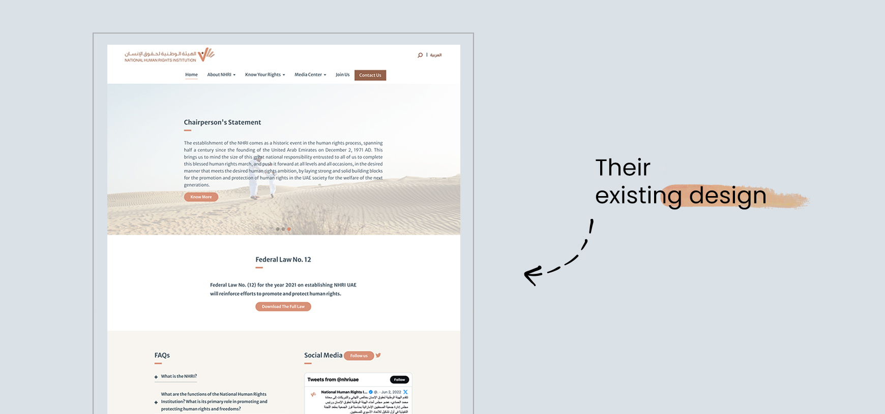 The old NHRI website struggled with multiple UI and UX issues. The layout was cluttered, with inconsistent spacing, small typography, left-aligned text blocks, and an overloaded hero section with lengthy copy, all of which increased visitor confusion. Poor design choices and a weak visual hierarchy resulted in an outdated and unattractive aesthetic. As a result, users found it difficult to easily locate important information. Key services, such as submitting complaints and understanding human rights, were hard to access. As a national human rights institution, the design failed to reflect NHRI’s identity, credibility, and significance. Although the institution has a critical mission, the current website does not effectively serve its users or stakeholders.