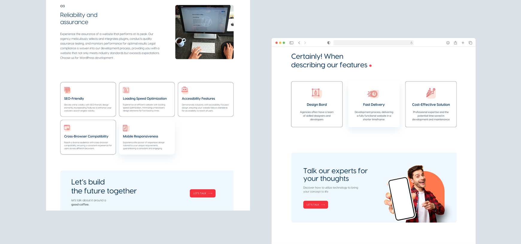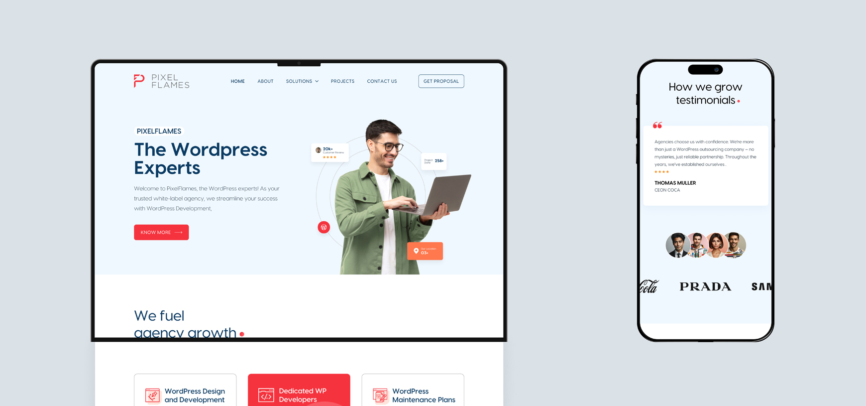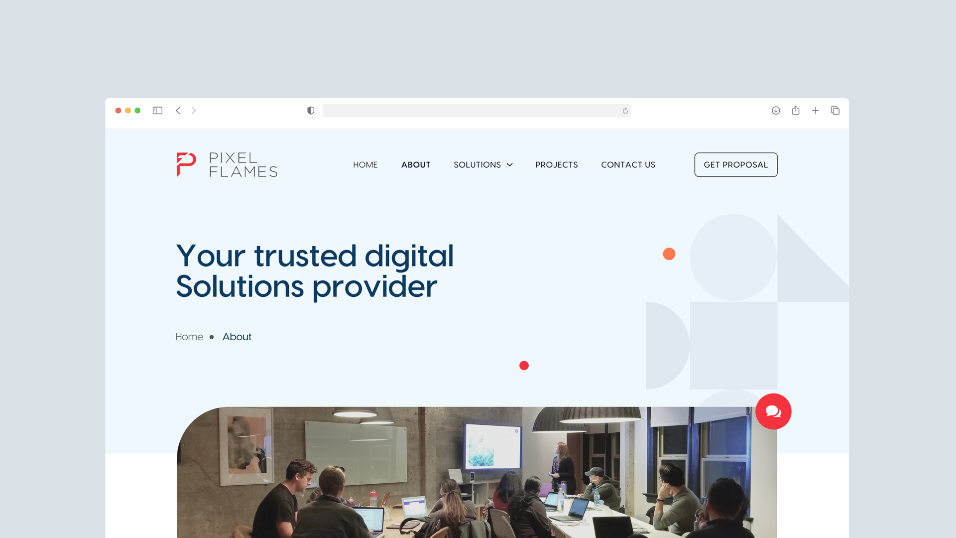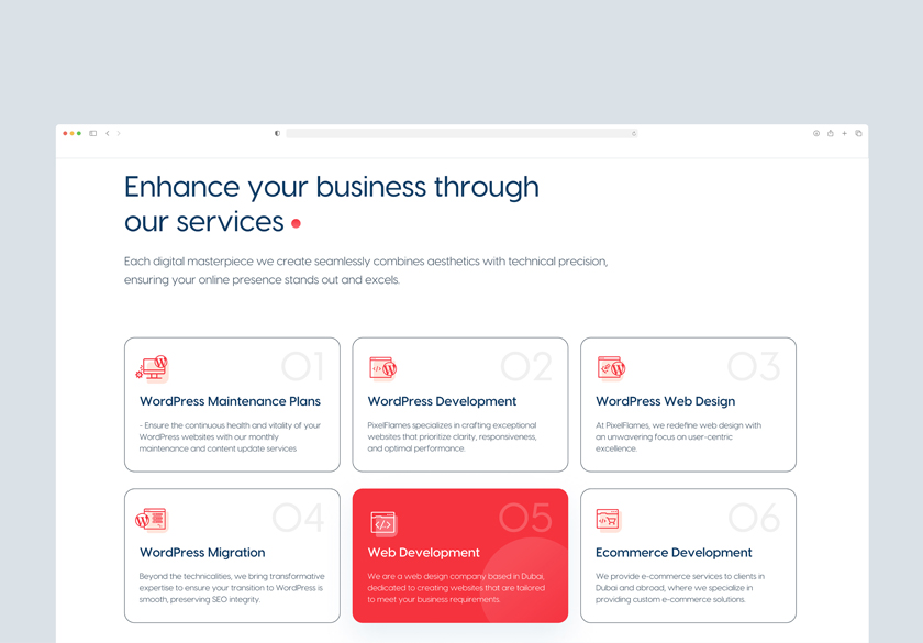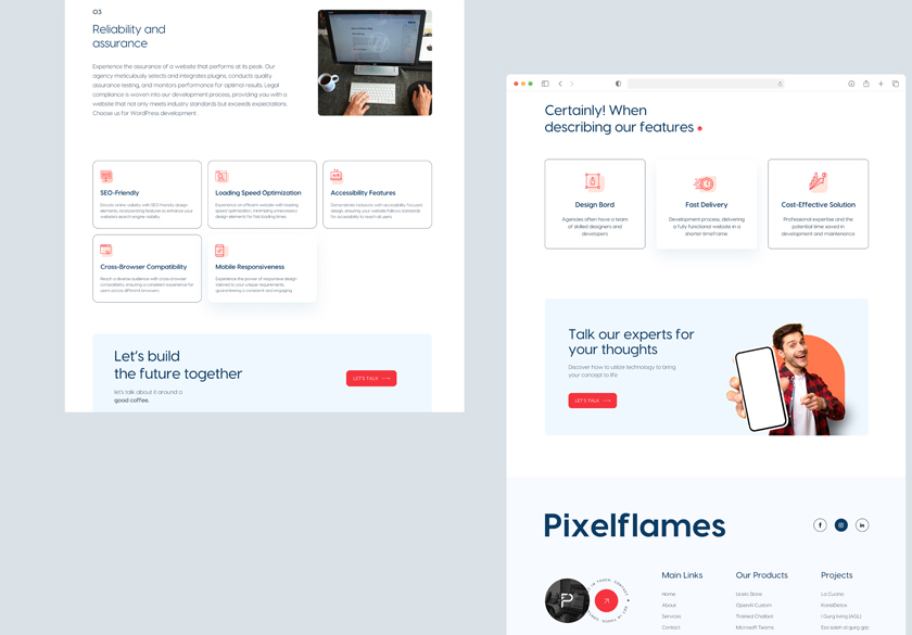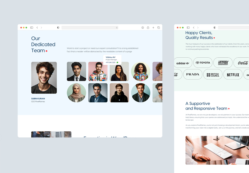 To address the UI challenges, a comprehensive design strategy was implemented. The website’s information architecture was simplified, with services organized into clear categories and dedicated pages for each offering. A professional visual identity was established using a refined color palette, clean typography, and high-quality imagery to reflect Pixelflames’ expertise. Lead generation was improved through prominent CTAs and an accessible contact form, guiding users toward inquiries. Scalable components were created within a design system to allow the site to grow smoothly with future case studies, blog posts, and portfolios. Finally, a mobile-first approach ensured fast, responsive, and intuitive interactions across all devices.